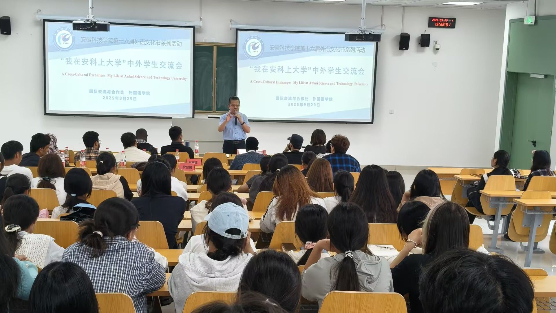 9月29日下午,完美app官方在线入口第十六届外语文化节“我在安科上大学”中外学生交流会在滁州校区学术报告厅举行。国际交流与合作处处长何世潮、外国语学院党委书记蔡为青、副书记张海亮出席,150余名中外学子参与交流。