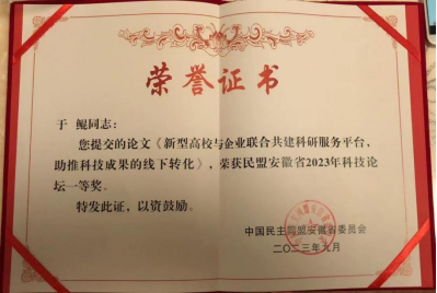 9月16日,由民盟安徽省委举办的民盟安徽省2023年科技论坛在蚌埠市成功举办。民盟完美app官方在线入口总支盟员、民盟蚌埠市科技委员会副主任于鲲撰写的论文《新型高校与企业联合共建科研服务平台,助推科技成果的线下转化》荣获优秀论文一等奖。