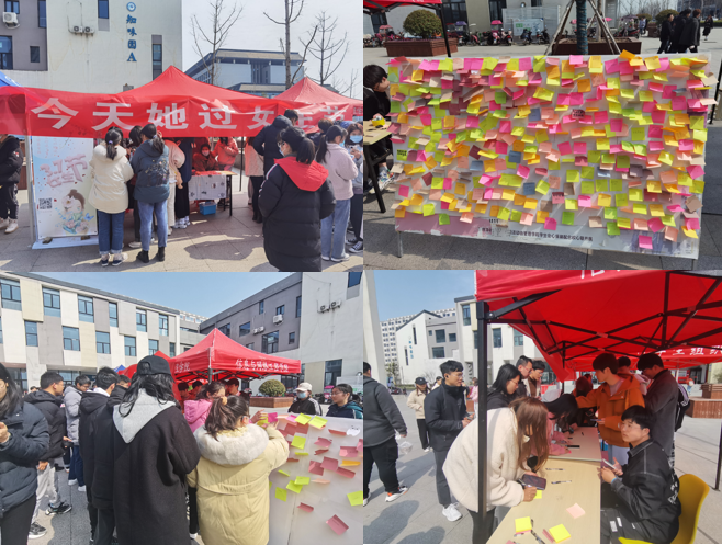 本次活动以“我想对她说”为主题,通过网络平台进行活动宣传。为了让全校女生们更好地感受节日的气氛,享受节日的祝福,使全校师生都参与到活动中来,同学们准备了“爱心签语”的祝福展板,来往的学生纷纷将写满自己祝福的便签纸贴到展板上,共祝学院女生们节日快乐。一行行优美的语句,一字字情真意切的文字,给女生们带来了阳光般的温暖,鲜艳靓丽的心愿便利贴也给校园增添了青春的气息。