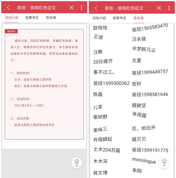本次活动以“传承红色基因、争做时代新人”为主题,采用线上线下相结合的方式,极大地提高了学生的参与度。参赛者围绕主题撰写网文,展现学生深厚的爱国主义情怀、人文思想与创新精神等。学院组织各班级辅导员、专业课教师、学生会成员成立评选组,开展集中评选,选出20份参加决赛的作品。将评选结果在学院官方QQ、易班微社区等平台公示,并在易班平台开展线上投票,扩大活动影响力。经过为期一个月的遴选评比,最终选出了10组获奖作品。