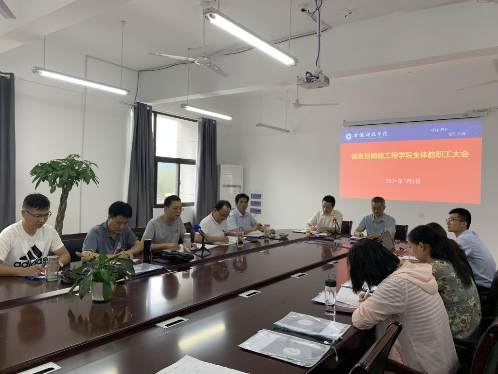 7月3日上午,信息与网络工程学院在尚行楼B418会议室召开教职工大会部署期末和暑期重点工作。学院党委书记王振其,正处级组织员周向群,党委副书记韦乃学,副院长何恩节,副院长曹浩及全体教职工参加会议,会议由学院院长余宏杰主持。