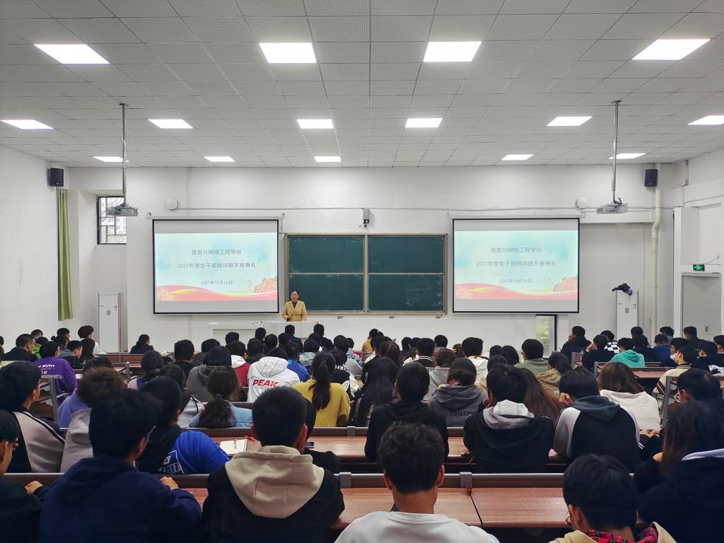 为加强学生干部队伍建设,提升学生干部工作能力和综合素质,更好的发挥学生干部作用。10月20日下午,信息与网络工程学院于致知楼B111举办2021年学生干部培训班开班典礼。学院党委副书记韦乃学,团委书记汪琦,专职辅导员陈凯、李军成、丁阿敏、崔北坤出席典礼。学院2021级全体班级学生干部、分团委、学生会、易班工作站、心理委员联合会等学生组织新入职同学参加典礼,典礼由汪琦主持。