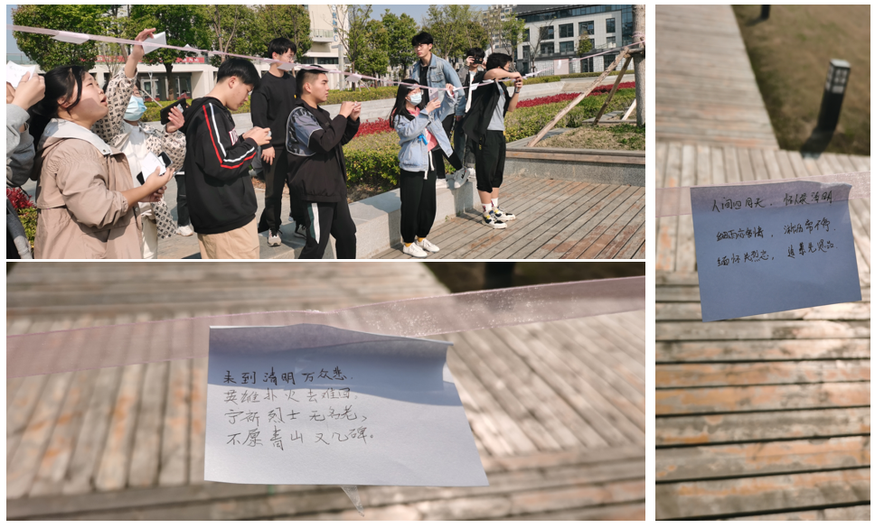 书写缅怀寄语,继承先烈遗志 在这个追思的日子里,为了让同学们了解先烈们坚贞不屈、英勇无畏的高贵品质和革命精神,丁阿敏组织班级同学在图书馆前通过抒写寄语的方式表达对烈士先辈们的敬仰和深深缅怀之情。网络工程212班团支书张家伟写到“人间四月天,怀人最清明;细雨亦多情,淅沥常不停;缅怀先烈志,追慕先贤品”;网络工程中韩211班学委蔡银锁写到“未到清明万众悲,英雄扑灭去难回,宁祈烈士无名老,不愿青山又几碑”。抒写的寄语被同学们粘贴在丝带上,供大家学习比较,也通过这种独特的方式表达缅怀、展望未来。