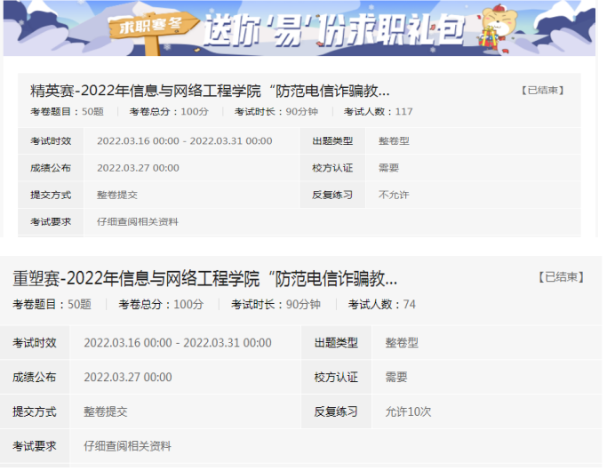 3月16日至31日,学院对未能及时参加“防范电信诈骗教育知识线上竞赛—初赛”的193名学生,展开重塑赛和精英赛等两个特色赛道,巩固并强化学生对防范电信诈骗的相关安全知识。学院一系列预防电信网络诈骗活动的成功开展,让同学们对电信诈骗有了更加深刻地认识,有助于提升同学们的安全意识,引导他们再今后的生活中更好地预防各类诈骗,保护好个人的财产安全。(特约通讯员:李军成 审核:韦乃学)