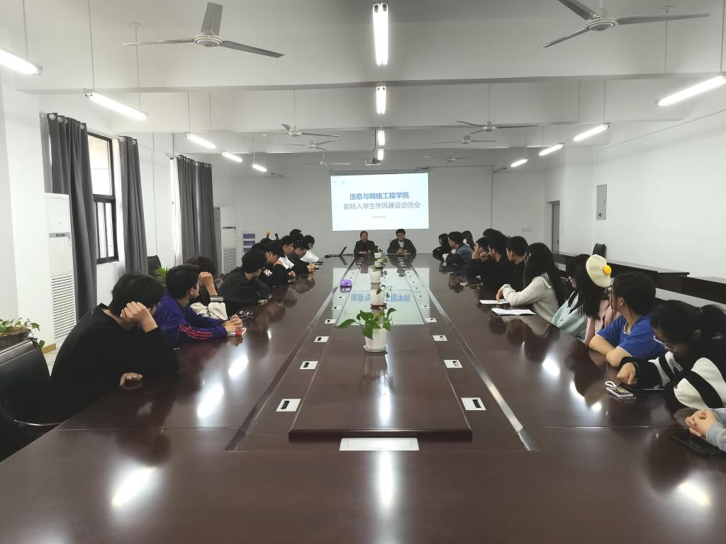 为进一步推动学院的学风建设,全面了解转入学生学习生活适应情况,4月12日下午,信息与网络工程学院在尚行楼B418召开新转入学生学风建设动员会。学院党委副书记韦乃学、专职辅导员许磊及新转入学生参加了本次会议,会议由韦乃学主持。