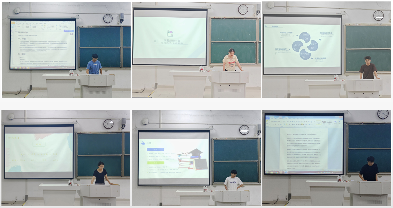 参加考研经验交流会的6位同学以优异成绩考取了长沙理工大学、中国科学院大学、安徽农业大学、西南大学、南京信息工程大学和辽宁石油化工大学。在经验分享环节中,他们结合自身的考研经历,先后围绕择校、初试备考、复试、面试等方面向大家做了详细的介绍,给备考的同学提出了宝贵的建议,如制定合适的学习计划、夯实数学基础、扩充英语词汇量、认真分析错题等。在交流互动环节中,同学们就备考期间遇到的问题积极提问,学长学姐们倾囊相授,现场气氛活跃。