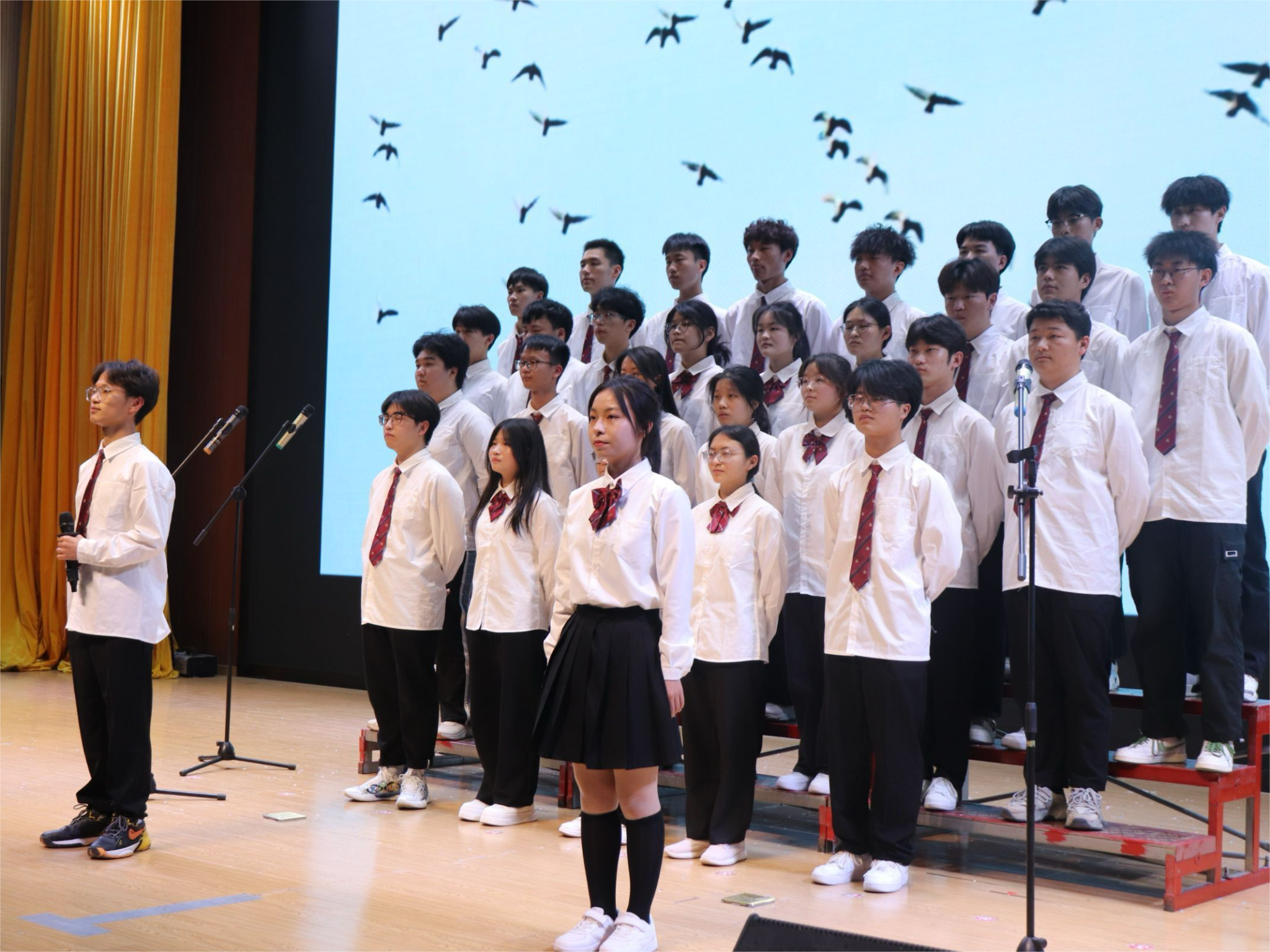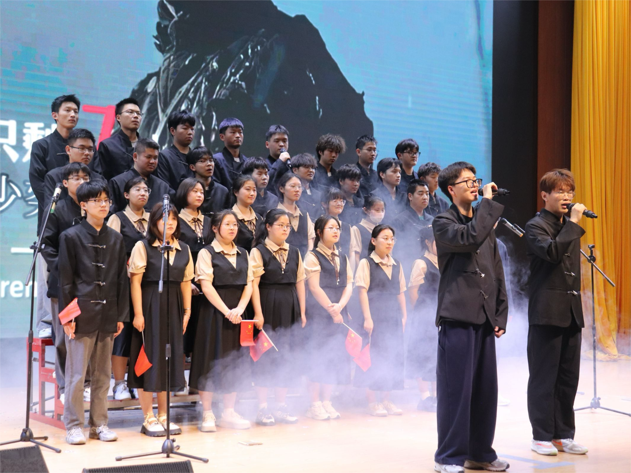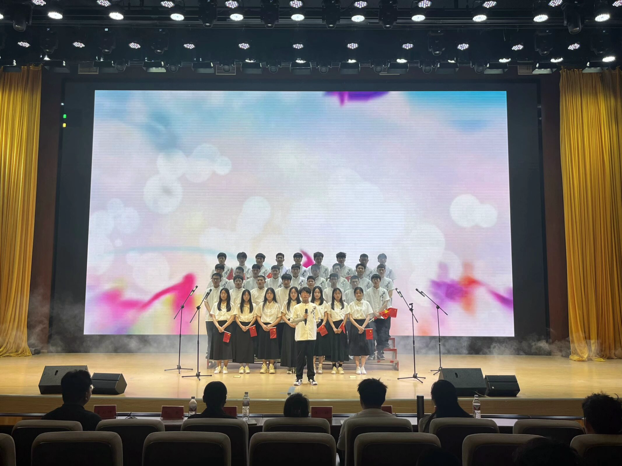 在经过前期一段时间的排练及准备,2023级共有11个班级参加本次比赛。每个班级都统一服装,同学们个个青春昂扬、精神饱满、歌喉嘹亮,表达了浓浓的爱国爱党之情,放声歌唱心中的美好憧憬。一首《有我》以激昂的旋律歌颂了青春万丈光芒,表达了青年学子坚定的理想信念;一首《微笑着胜利》歌声飘扬,引起现场观众的强烈共鸣,微笑着面对一切艰难困苦,终会迎来胜利;《披风》、《我们都是追梦人》、《平凡天使》唱出了新时代青年勇敢追梦,不甘平凡的精神面貌;《半生风雪学生版》、《少年中国说》述说了青年学子对未来的憧憬及追求,点燃了现场观众的热情,赢得阵阵掌声;耳熟能详的《国家》、《北京欢迎你》、《紫荆花开》、《红星闪闪》、《歌唱祖国》歌颂了对党和祖国的浓厚热爱之情;最后,由学生会全体成员献出的《明天会更好》唱出了每个人心中期待明天会更好的美好心愿,将现场气氛推向了高潮。
