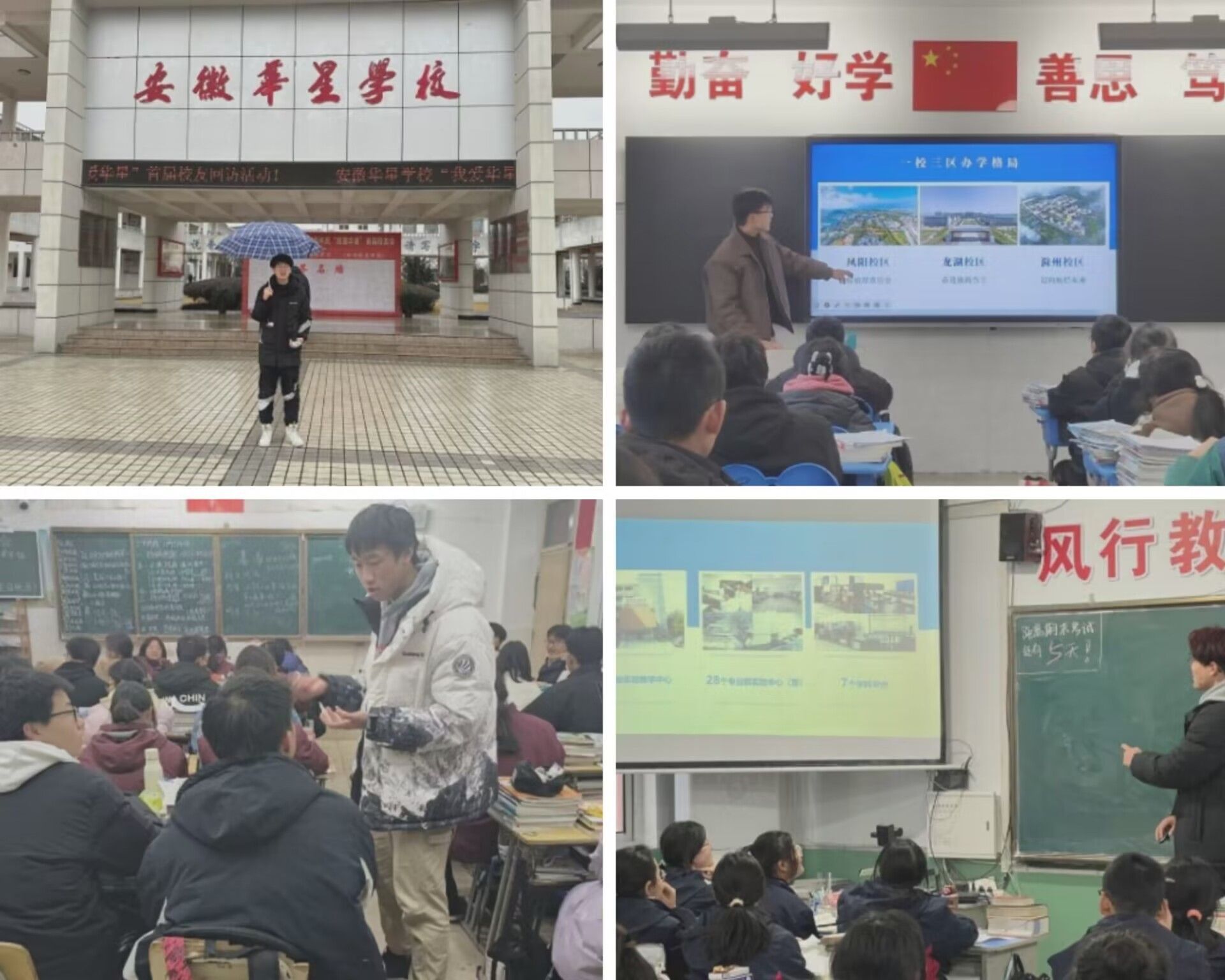 累计11支实践团队前往芜湖、滁州、淮南的部分高中开展“我回母校报喜讯”2024寒假社会实践,例如:安徽华星学校、滁州市旅游商贸学校、滁州应用技术学校、定远二中、定远化工学校、天长工业学校、安徽芜湖县一中、芜湖市第十二中学、淮南四中、安丰高级中学等学校。
