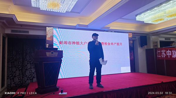 会上,蚌埠市农业农村局种植业科科长赵天聪、农经科科长杨文銮做了惠农政策解读,国元保险蚌埠中支农业保险部经理花苗、蚌埠市农商银行零售银行部经理苏炀做了涉农保险和贷款业务介绍。江苏中旗作物保护科技有限公司总经理陈伟、上海生农生化制品股份有限公司销售总经理杨全志、安徽辉隆集团五禾生态肥业有限公司销售经理刘兴松、安徽尚禾沃达生物科技有限公司总经理欧亮亮分别做了产品介绍。蚌埠市农学会常务理事、安徽省金珠农业科技有限公司总经理胡本锦做了种植大户社会化服务介绍。(特约通讯员:吴国良 摄影:李孝良 审核:沈树周)