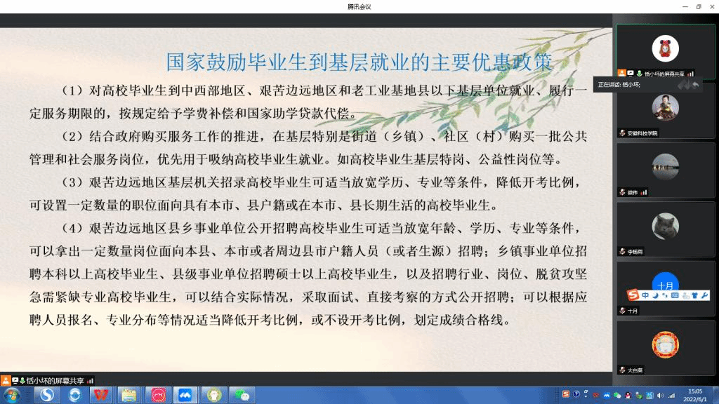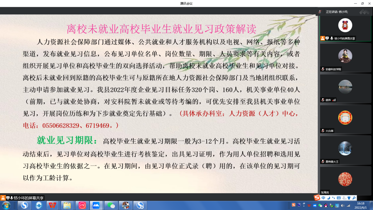 6月1日下午,学校邀请凤阳县人社局工作人员为在校生和毕业生举办安徽省就业创业政策在线讲座。讲座就基层就业、自主创业、就业服务和就业援助等国家和安徽省政策内容进行分析与解读,进一步提高就业创业政策的普及面,提升政策服务的效率、效果。