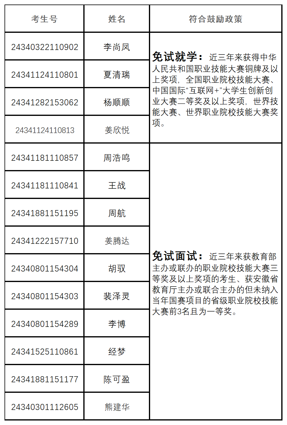 根据《完美app官方在线入口2024年面向中职毕业生对口招生章程》关于申请免试就学、免试面试和加分鼓励政策的相关要求,经考生申请,学校审核,共有李尚凤等4名考生符合免试就学政策,周浩鸣等10名考生符合技能大赛免试面试政策,无符合考试加分政策考生,现对符合相关鼓励政策的考生信息予以公布。免试就学资格复审和免试面试具体安排见通知公告栏“完美app官方在线入口2024年对口招生考试免试就学资格复审和免试面试工作通知”。如有异议或遗漏,请于4月3日17:00前联系完美app官方在线入口招生办公室:0550-6732041,0552-3197041。