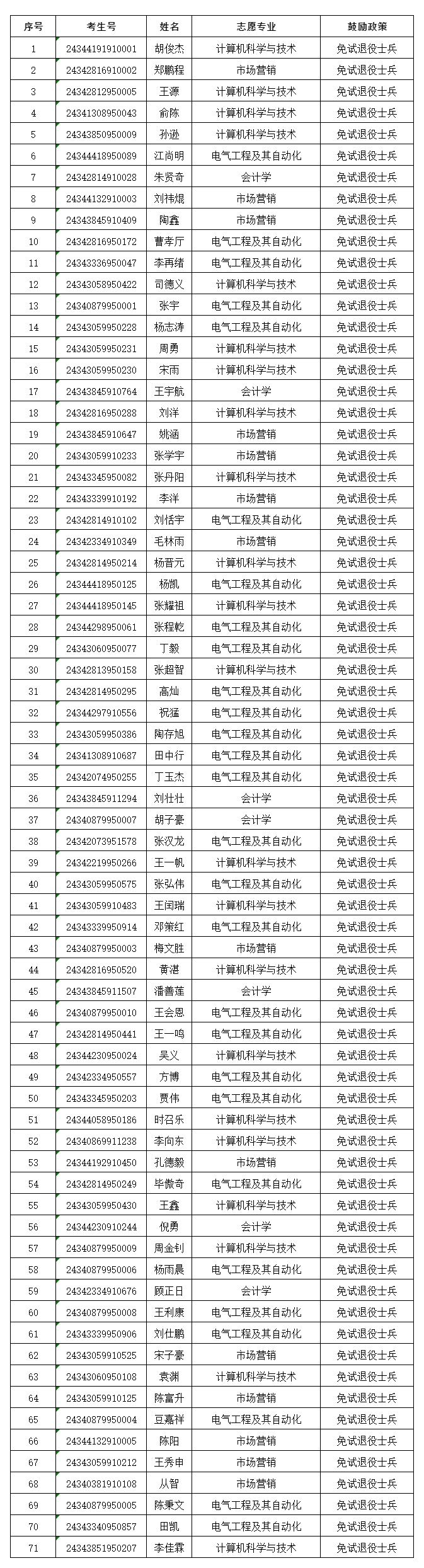 根据《完美app官方在线入口2024年普通高校专升本招生章程》关于申请免文化课考试退役士兵专项计划,相关要求,经审核,胡俊杰等71名考生符合申请免试条件,现予以公布。如有异议或遗漏,请于4月9日12:00前,与完美app官方在线入口招生办公室联系。联系电话:0550-6732041,0552-3197041。