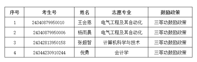 根据《完美app官方在线入口2024年普通高校专升本招生章程》关于申请三等功鼓励政策相关要求,经审核,王会恩等4名考生符合申请免试条件,现予以公布。如有异议或遗漏,请于4月9日12:00前,与完美app官方在线入口招生办公室联系。联系电话:0550-6732041,0552-3197041。
