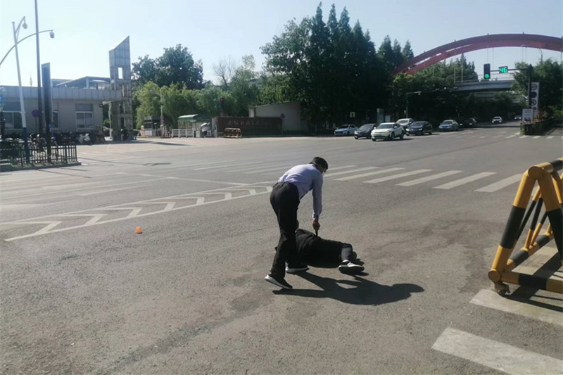 演练前,派出所民警向在场的安保人员详细讲解今天反恐场景(持刀砍人类)。一门暴徒首先持刀砍伤校门前一名路人,随即冲到校门口叫嚣着想要强闯校园,值班门卫见状立即向保卫处领导汇报情况,保卫处领导立即下令:“立即启动反恐应急预案”,随即拨打110报警。三名保安手持防暴器械冲出校门与暴徒周旋,一边力图制服暴徒,一边等待民警到来。很快派出所民警赶到将暴徒制服带走。整个演练过程,校警安保力量配合得力,场景真实、生动、逼真,气氛紧张,达到了演练预期效果。