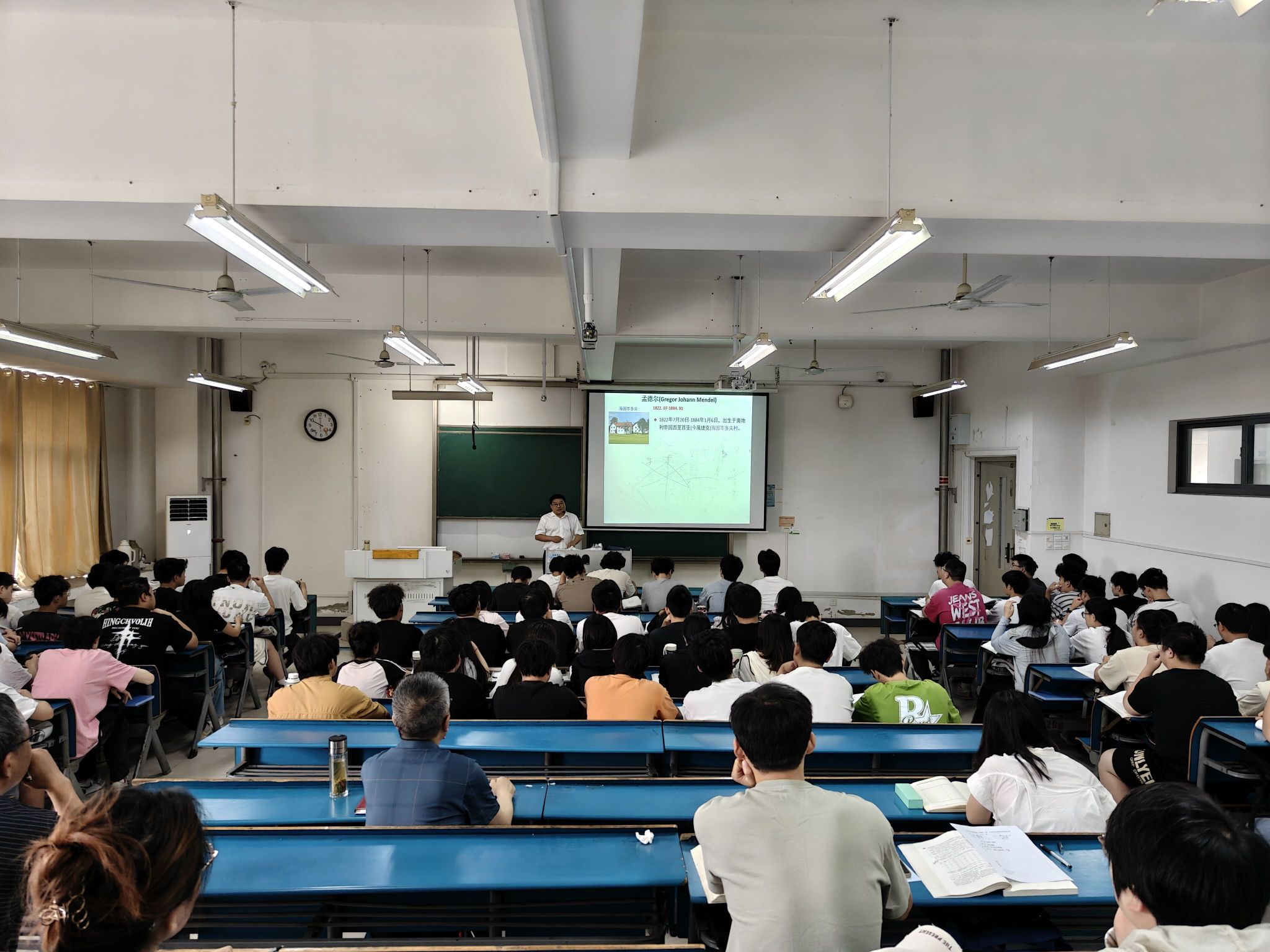 黄先忠教授以生动的个人经历导入课程,从在欧洲求学期间与孟德尔研究所的渊源讲起,引出孟德尔遗传学的历史背景与科学价值。随后,他结合课本内容,向学生展示了孟德尔实验中所用的豌豆实物,直观阐释了豌豆性状的遗传特点,帮助学生深化对分离定律和自由组合定律的理解。授课过程中,黄教授将经典理论与现代遗传学进展相结合,通过案例分析启发学生思考,课堂氛围活跃,师生互动热烈。