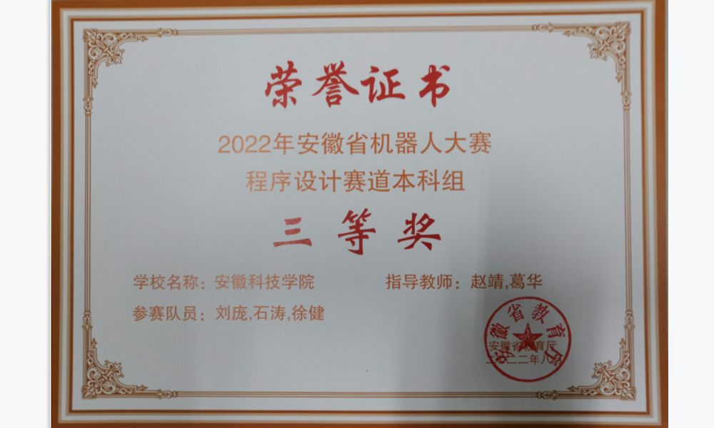 党支部党员获安徽省2022年安徽省机器人大赛三等奖荣誉证书