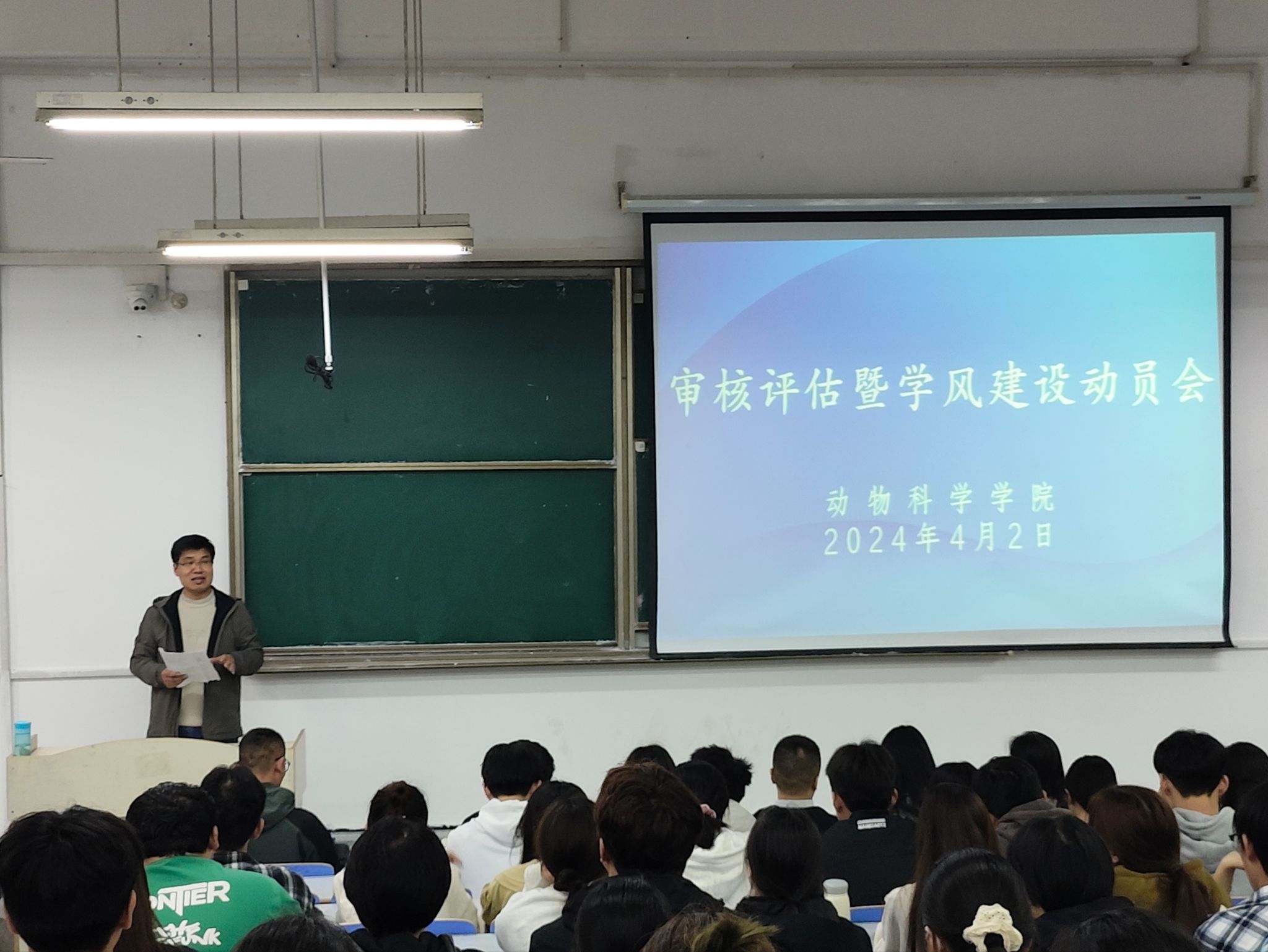 汤帅首先讲解了本科教育教学审核评估的目的、意义和要求,强调学校审核评估取得良好成绩对学生的积极影响,并向同学们宣读了动物科学学院2024年学风建设实施方案,要求同学们根据方案认真完成各项任务。他强调,各位学生干部要带领同学们认真学习本科教育教学审核评估应知应会,加强班级凝聚力和班风学风建设,努力打造安科名片,树立动科形象。