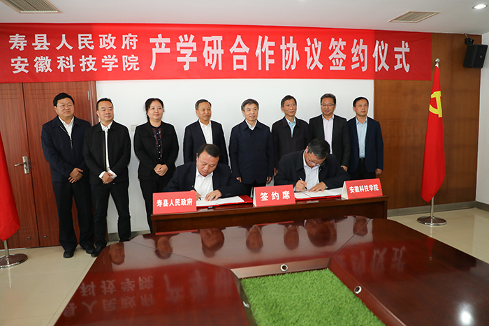 Jiang Deqin, Party Secretary of Anhui Science and Technology University, Li Zhen, deputy party secretary and president of the university, Niu Fangkuo, secretary of Shouxian County Party Committee, Sun Qizhi, deputy secretary of the county party Committee and county magistrate, and Zhu Yong, chairman of the CPPCC, attended and witnessed the signing ceremony. (Han Shaohua, President's Office)