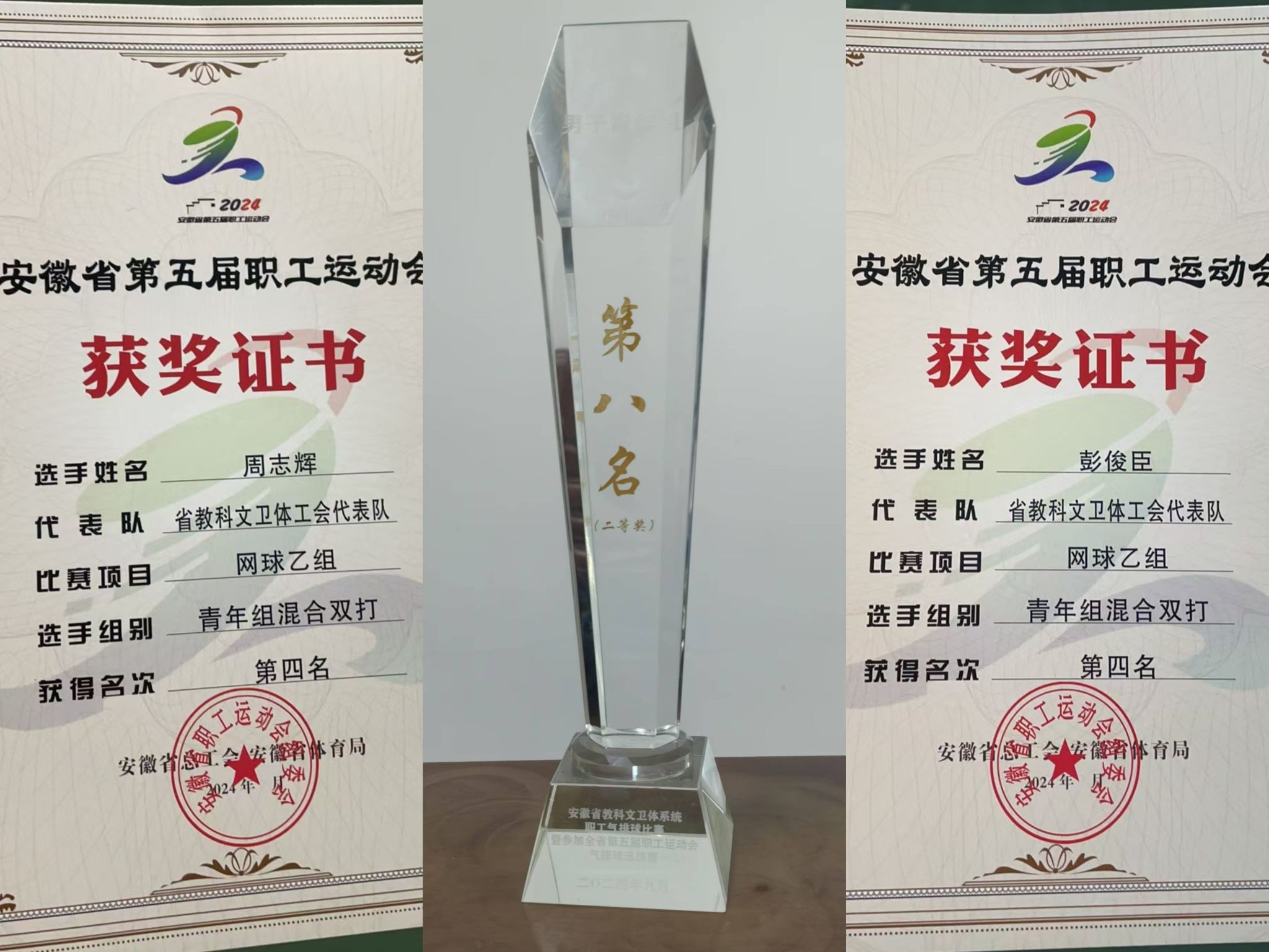 11月8-10日,安徽省第五届职工运动会网球比赛在安徽六安小球训练基地举行。我校体育教学部彭俊臣、周志辉二位老师参赛,荣获混双第四名好成绩。