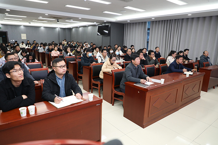 科研处、管理学院、财经学院、信息与网络工程学院、马克思主义学院、资源与环境学院相关领导和骨干教师,以及我校农业管理领域研究生参加报告会。(特约通讯员:江旭聪 摄影:陈宝 审核:陈传万)