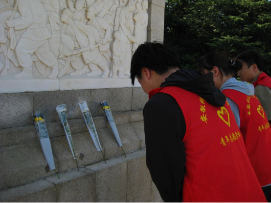 为了表达对革命先烈的敬仰,团队四人在高大雄伟的烈士纪念碑前默哀留念,为伟大的革命先辈们献上花束。静静的追思,深深地缅怀,寄托深情的思念和最崇高的敬意。