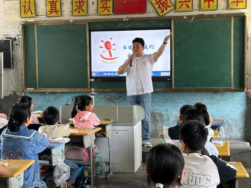 “我们要走进乡村、走进课堂更要走进留守儿童的内心,同时我们要会听多听,让孩子们会说多说”。活动中,志愿者王黎明向孩子们分享了自我介绍的“六字法”,并引导孩子们及时展现自信的微笑,鼓励他们勇敢上台。在志愿服务团队的引导下,许多孩子从最初的不敢说、不想说,逐渐转变为我敢说、我想说。
