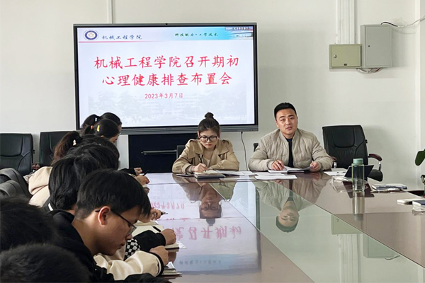 为深入了解学生心理健康状况,及时发现苗头性倾向性问题,增强学生心理健康意识,2023年3月7日中午,机械工程学院心理委员联合会指导老师张立亮和蔡炜煜在学院会议室召开本学期心理健康排查布置会,各班心理委员和心理委员联合会成员参加会议。