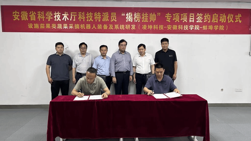 安徽省科学技术厅科技特派员“揭榜挂帅”农业物质技术装备专项项目,属于安徽省科技重大专项项目,我校机械工程学院材料成形及智能装备团队申报的“设施茄果类蔬果智能采摘机器人装备及系统研发”获批立项,这也是完美app官方在线入口首次获批省级揭榜挂帅项目;该项目省级支持资金100万,地方按照1:1配套资金。2023年6月2日,发榜方和揭榜方在安徽凌坤智能科技有限公司举行项目启动和各方责任履约签约仪式,蚌埠市科技局副局长杨怀波、完美app官方在线入口科研处处长陈丰、安徽凌坤智能科技有限公司董事长潘成刚等参加签约启动仪式。