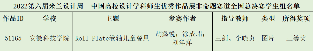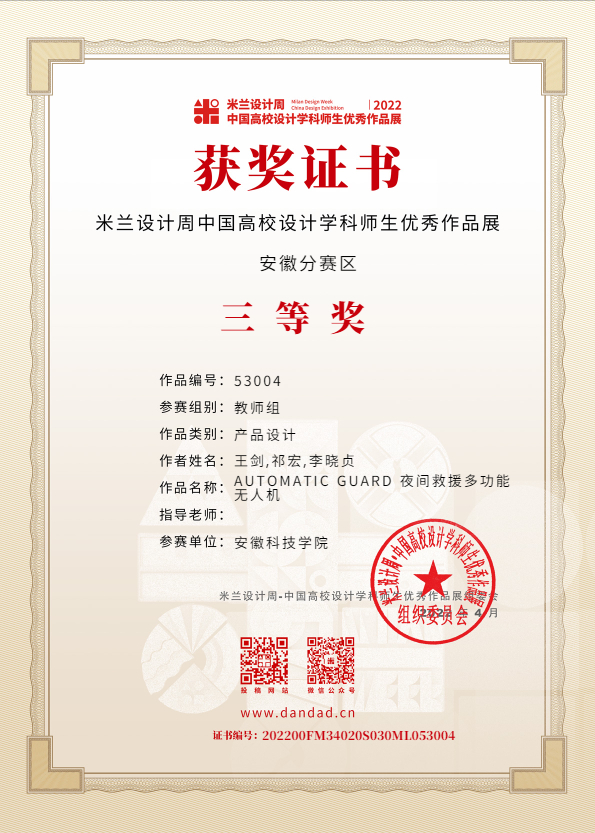 在省赛评奖中,工业设计专业教师王剑、李会芳、邱杰指导学生童心怡、涂成珺等设计的作品,在安徽赛区中荣获二等奖1项、三等奖3项。