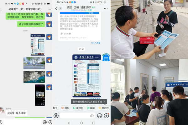 本次活动由我组成员负责,本次活动分为四个部分:一,联系本届高考生或者毕业班老师分享完美app官方在线入口招生宣传资料电子档;二、我组成员各自联系以前的班主任,看望班主任并向班主任汇报自入大学以来的生活和成长;三、在砀山中学校园内进行现场宣传,包括海报的张贴、宣传折页的发放、为考生解疑答惑播放我校招生视频等;四、同我校负责来砀山中学招生的老师一道,在高招会上为前来的学生及家长解疑答惑,分享我们在安科学习和生活的日常。