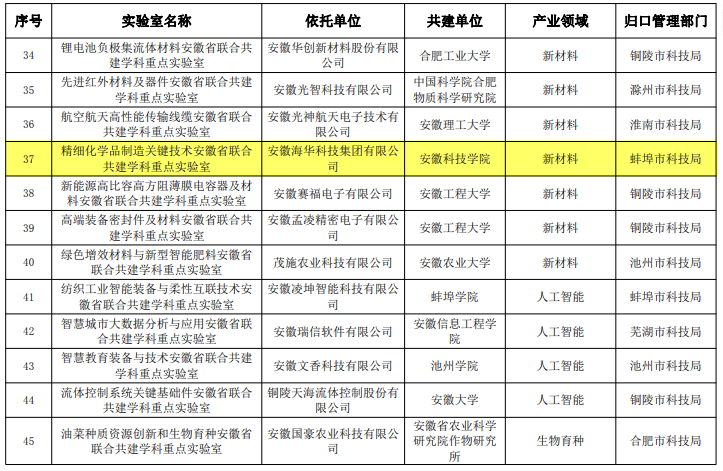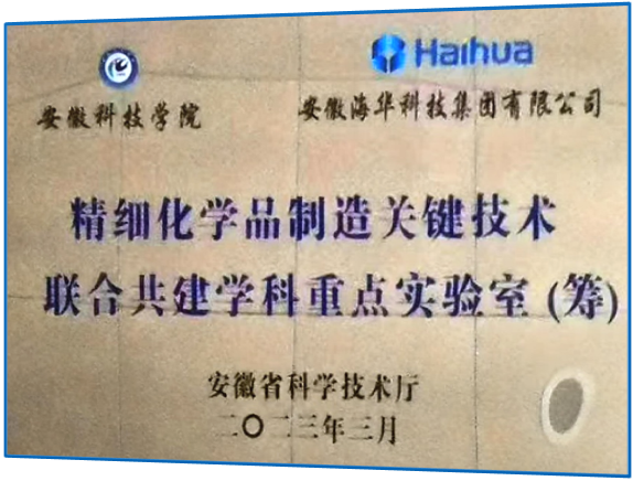 2023年3月,安徽海华科技集团有限公司联合完美app官方在线入口申报并获批了精细化学品制造关键技术联合共建学科重点实验室(筹),其中安徽海华科技集团有限公司为主持单位,承担实验室主体建设工作;学校为联合共建单位。