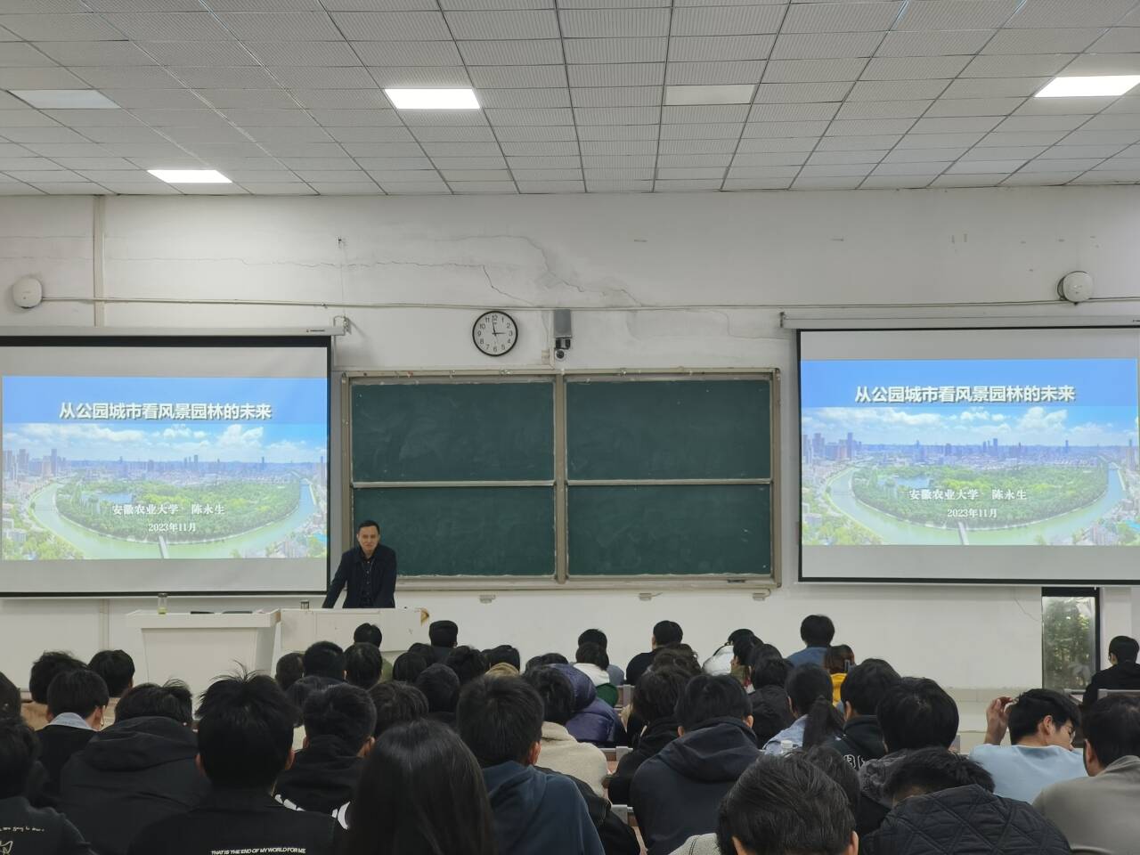 陈永生以人民为中心、生命共同体的宏观理念,概括了公园城市建设的发展进程、特色与政策、机遇和挑战,以打造合肥国家级生态城市为例,详细阐述了合肥城市园林的建设与发展,通过典型案例展现了以绿水青山为代表的“风景园林之美”。在互动环节,就科研反哺教学、学科发展趋势等热点问题,作了针对性回应。最后,陈永生对学生提出了“热爱生活、欣赏艺术、尊重历史、关爱生活、关注技术”的殷切希望!