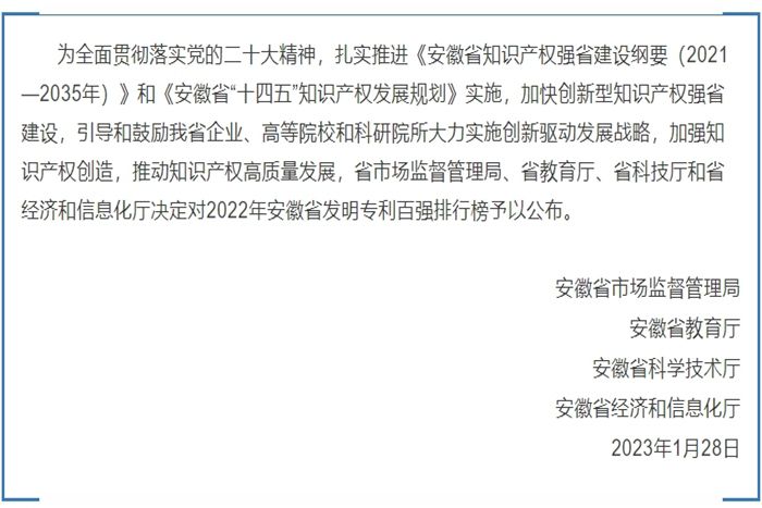 据悉,安徽省发明专利百强排行榜发布旨在全面贯彻落实党的二十大精神,扎实推进《安徽省知识产权强省建设纲要(2021—2035年)》和《安徽省“十四五”知识产权发展规划》实施,加快创新型知识产权强省建设,引导和鼓励我省企业、高等院校和科研院所大力实施创新驱动发展战略,加强知识产权创造,推动知识产权高质量发展。(特约通讯员:刘晓丹 审核:陈丰)