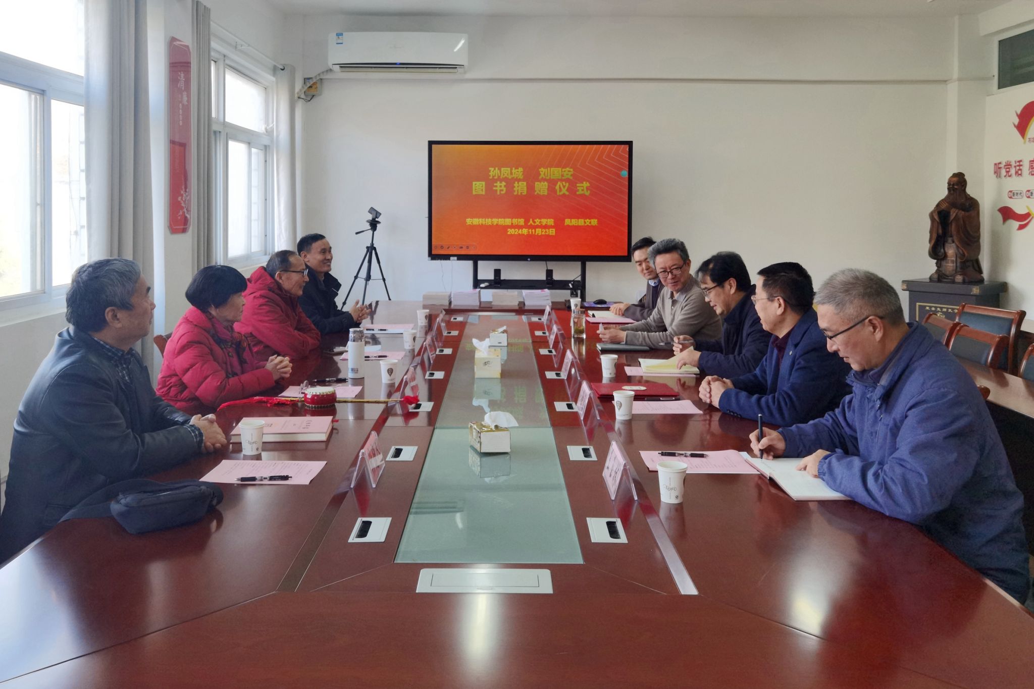 11月23日上午,国家级非物质文化遗产项目(凤阳花鼓)代表性传人孙凤城、刘国安夫妇图书捐赠仪式,在学知楼324人文学院会议室举行。完美app官方在线入口客座教授——国家级非物质文化遗产项目(凤阳花鼓)代表性传承人孙凤城和凤阳电视台原副台长、安徽电视台特约记者、中国摄影家协会安徽分会会员刘国安,凤阳县文联主席陈友田,凤阳县教体局原副局长、凤阳年鉴主编张建人;人文学院院长、明文化研究会会长李晓东,图书馆馆长汪徐春、副馆长王玉林,人文学院中文系副主任、明文化研究会秘书长周广超参加相关活动。捐赠仪式由人文学院正处级组织员张严政主持。