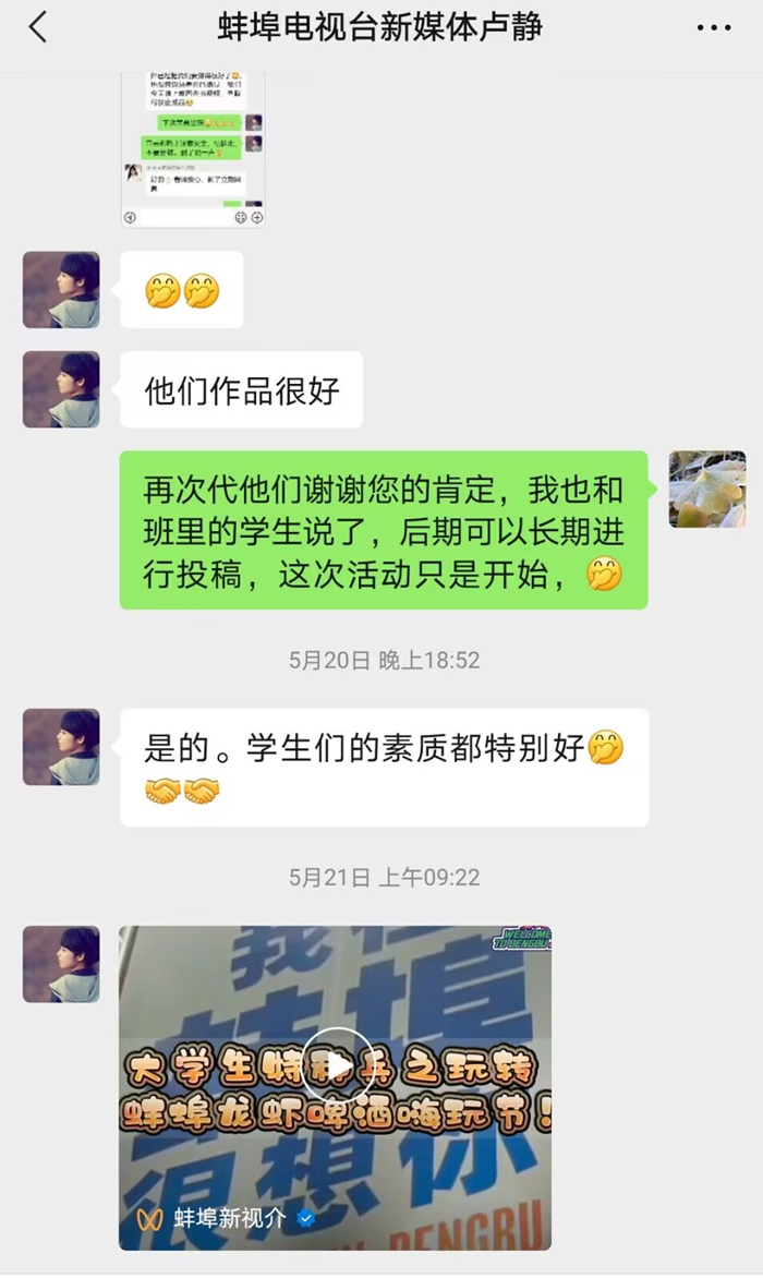 5月19日,为期一周的蚌埠市龙虾啤酒嗨玩节拉开大幕,应蚌埠广播电视台邀请,我校组织多名学子前往活动现场参与文化实践。其中,首届媒体融合实践班学员——汉语言文学专业韦容和农学专业汪宇欣同学拍摄的短视频作品被采用,发布在蚌埠广播电视台视频号蚌埠新视介上,获得了广泛关注和赞誉。