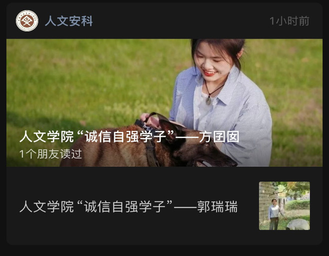 5月9日至13日,21、22、23级以年级和专业为单位,推荐诚信自强之星,被推荐同学的优秀事迹在人文安科公众号上发表宣传,为广大学子树立“诚信自强”先进典型。