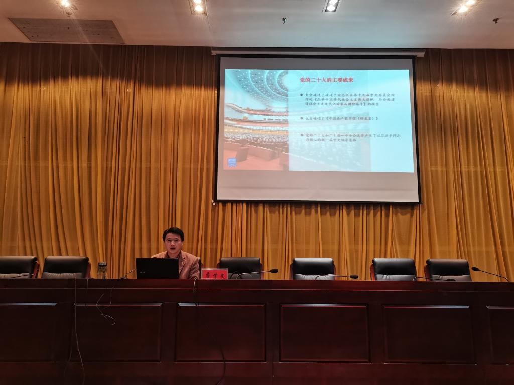 詹学文以“学习贯彻党的二十大精神,助力学院事业全面发展”为主题,介绍了中国共产党第二十次全国代表大会召开的时代背景和大会盛况,强调要深刻领会党的二十大的重大意义、准确把握党的二十大精神实质。重点围绕“关于党的二十大的主题”“关于过去5年的工作和新时代10年的伟大变革”“关于马克思主义中国化时代化”“关于中国式现代化”“关于全面建设社会主义现代化国家的目标任务”“关于坚持党的全面领导和全面从严治党”等方面对党的二十大精神进行阐述和讲解。他强调,党的二十大报告是马克思主义的纲领性文献,大家必须全面准确深入理解内涵,精准把握外延,深刻领会党的二十大关于教育工作的战略部署。本次党课主题鲜明、逻辑严密、内涵丰富,既有政治高度、又有理论深度,对学院师生党员深刻领会、准确把握党的二十大精神具有较强的启发和指导意义。