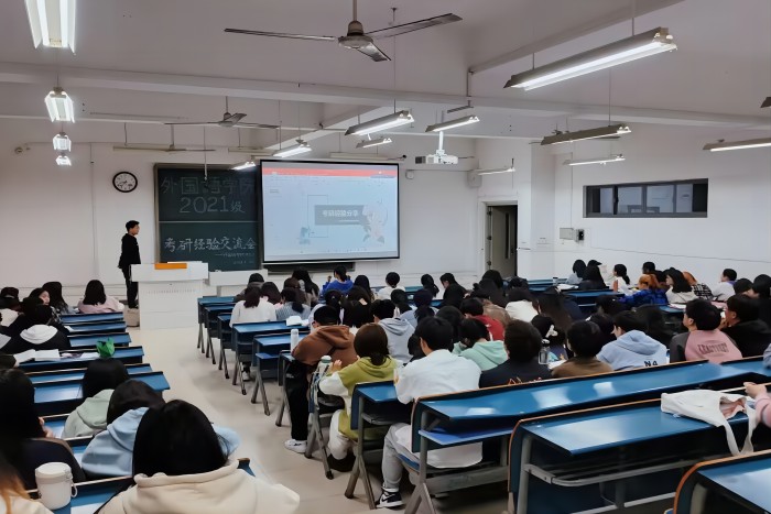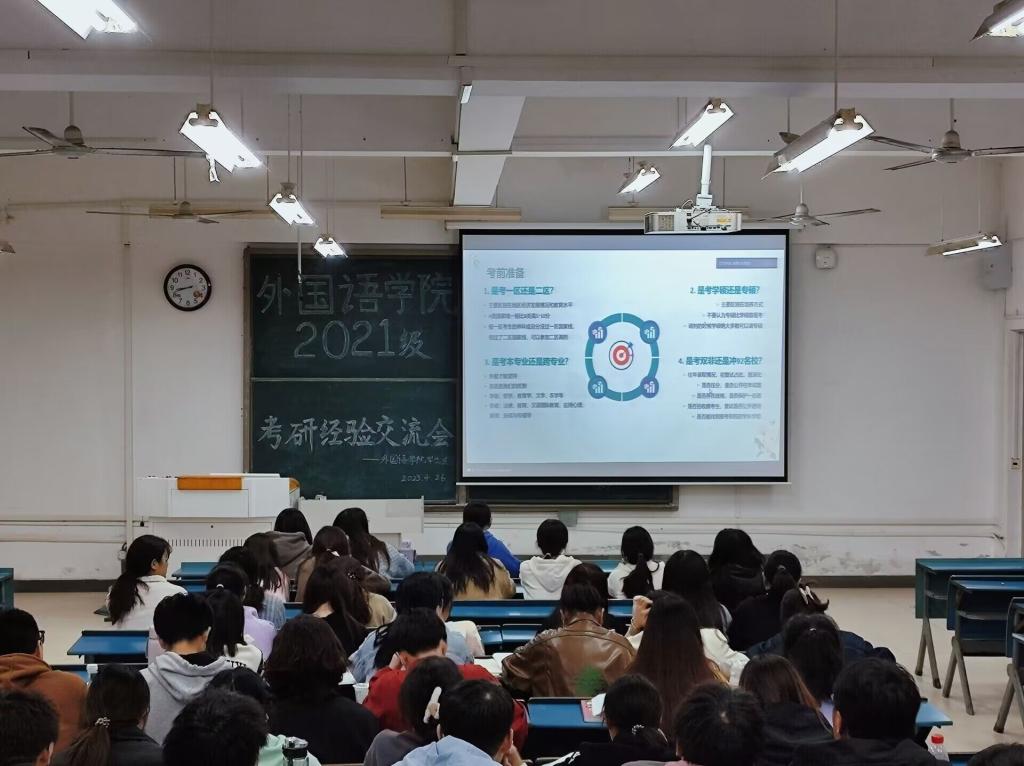 为充分发挥优秀毕业生榜样作用,做好大学生朋辈辅导,4月26日晚,外国语学院在新知楼B座202、203教室举办了考研经验交流会。学院党委书记蔡为青、党委副书记张海亮及全体辅导员和学院2020级、2021级全体学生参会。交流会由学院主持队杨雨甜主持。