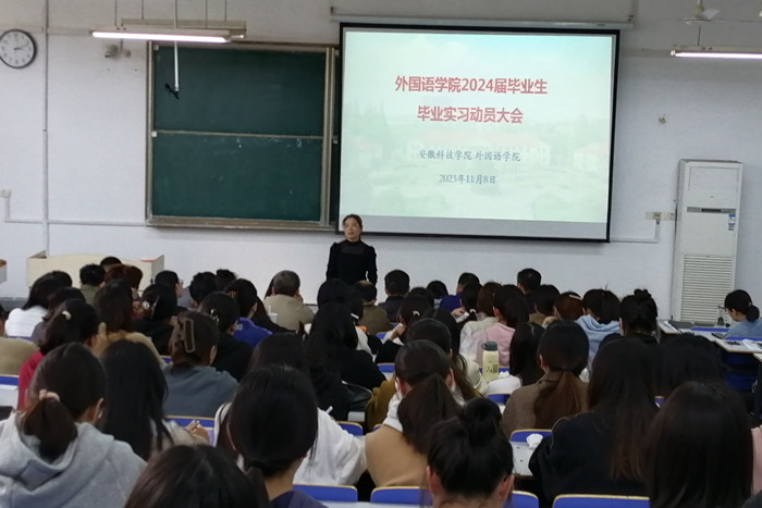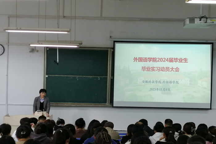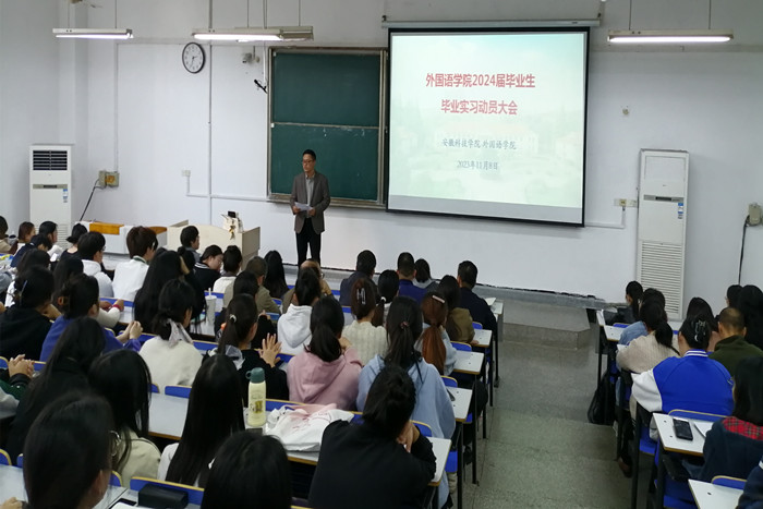 为做好2024届毕业生实习工作,外国语学院于11月8日下午在求知楼A106教室举行了外国语学院2024届毕业生实习动员大会。外国语学院党政领导、毕业生实习指导教师和2024届全体毕业生参加了该次会议。会议由副院长洪民主持。