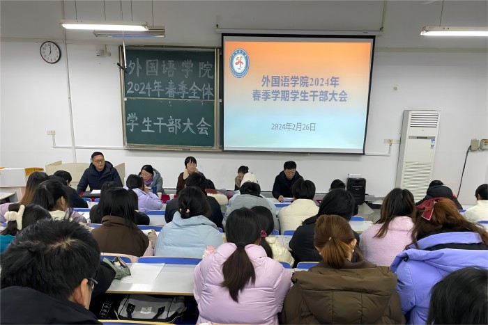 为加强学生干部队伍的凝聚力、战斗力,外国语学院于2月26日晚在求知楼A座106教室召开2024年春季学期学生干部大会。学院党政领导出席会议,全体辅导员,群团组织负责人,各班级班长、团支书、学习委员参加会议。会议由学院党委副书记张海亮主持。