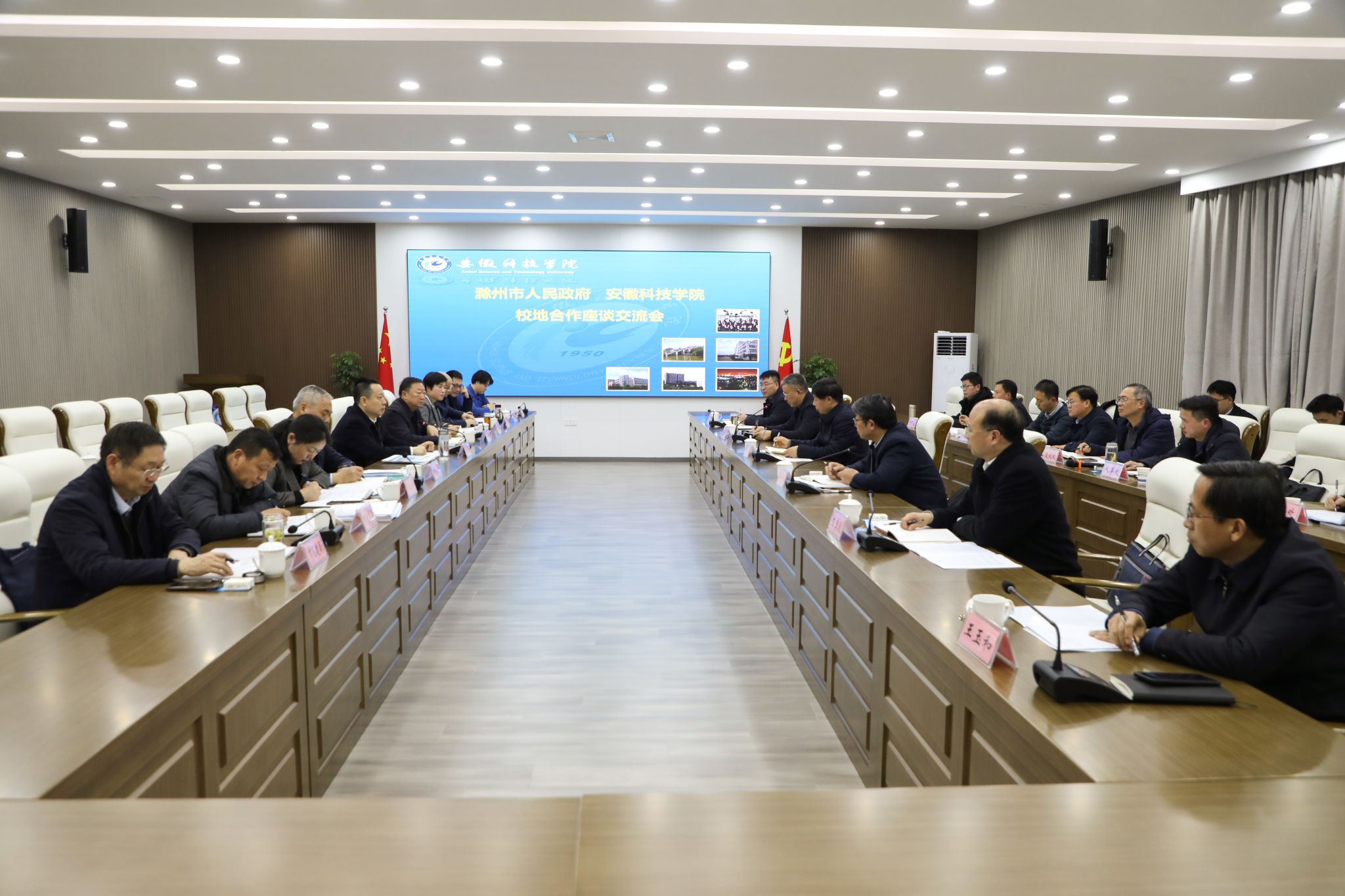3月3日下午,我校与滁州市人民政府举行校地合作座谈交流会。滁州市委副书记、市长胡春华,市人大常委会副主任苏虹及市直有关部门、南谯区政府负责人,完美app官方在线入口党委书记时伟,党委副书记、院长李升和,党委副书记曹付忠,党委委员、副院长王孝义、赵伟峰、王玉和及相关部门负责同志参加座谈交流会。会议由时伟主持。