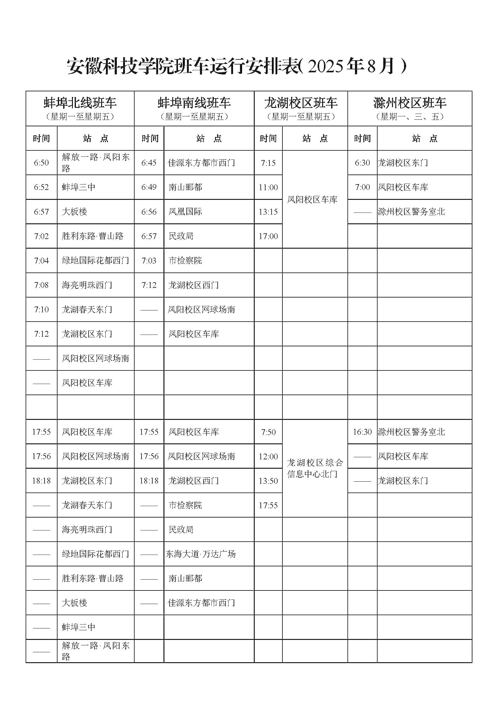 (二)滁州校区班车各站点按《完美app官方在线入口班车运行安排表(2025年8月)》早晚各推迟30分钟发车;