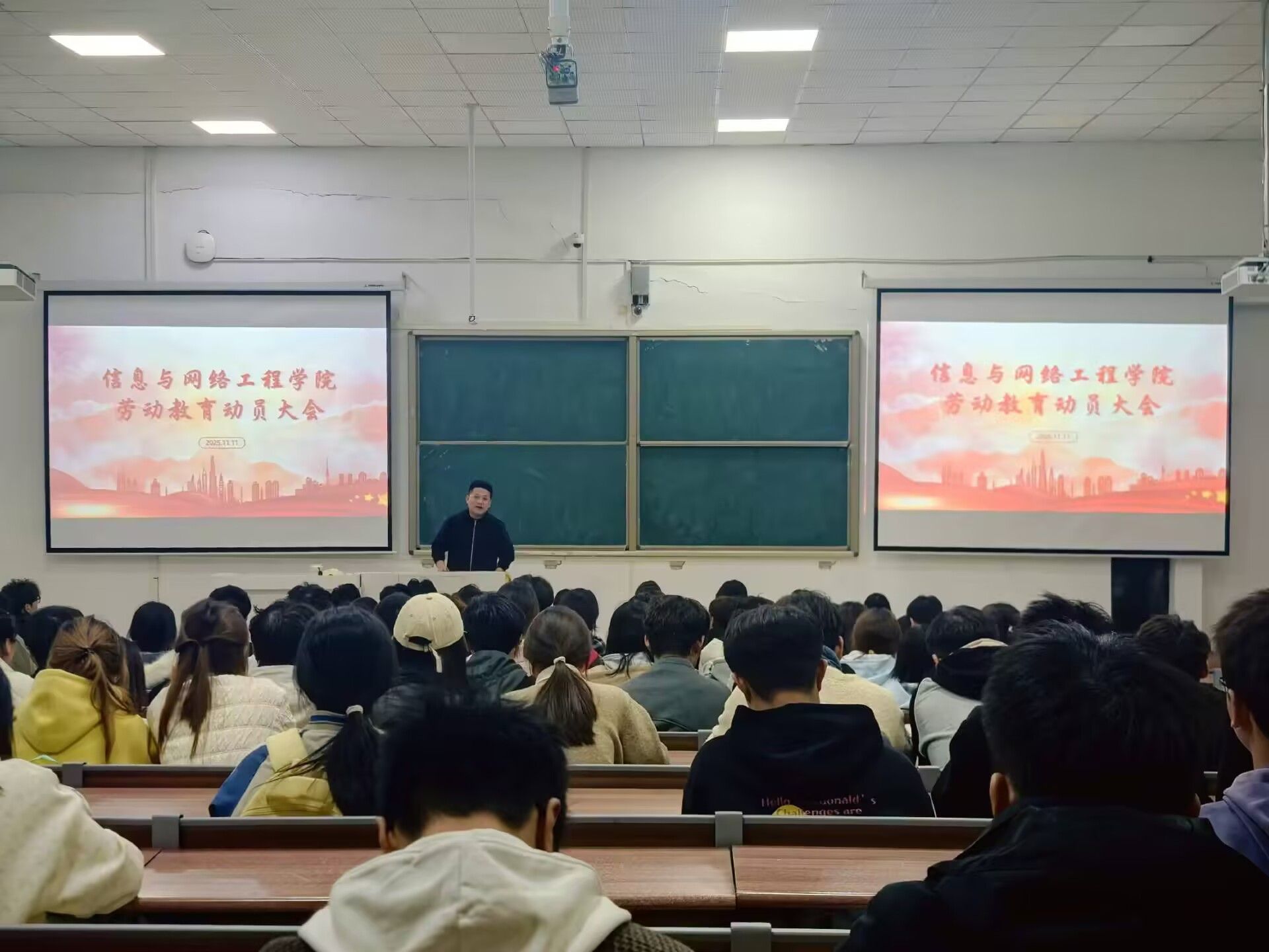 为推进劳动教育落地生根,引导学生树立正确劳动观、养成良好劳动习惯。11月11日晚,信息与网络工程学院在致知楼A111召开2025-2026学年第一学期劳动教育动员大会,劳动教育负责老师崔北坤,2022级-2025级各班班委及学生会成员参加本次会议,本次会议由崔北坤主持。