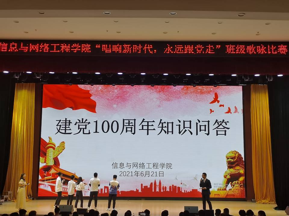 为深入学习贯彻习近平总书记在党史学习教育动员大会上的重要讲话精神,教育引导广大青少年肩负历史使命、传承红色基因。6月21日晚,信息与网络工程学院在东辅楼报告厅举办“唱响新时代,永远跟党走”班级歌咏比赛,校学生处副处长胡文靖、信息与网络工程学院党委书记王振其、院长余宏杰、正处级组织员周向群、党委副书记韦乃学、全体辅导员莅临现场指导并担任评委,2020级全体学生参加比赛,比赛由朱翔、曹淑婧、田思佳、陈良戈主持。