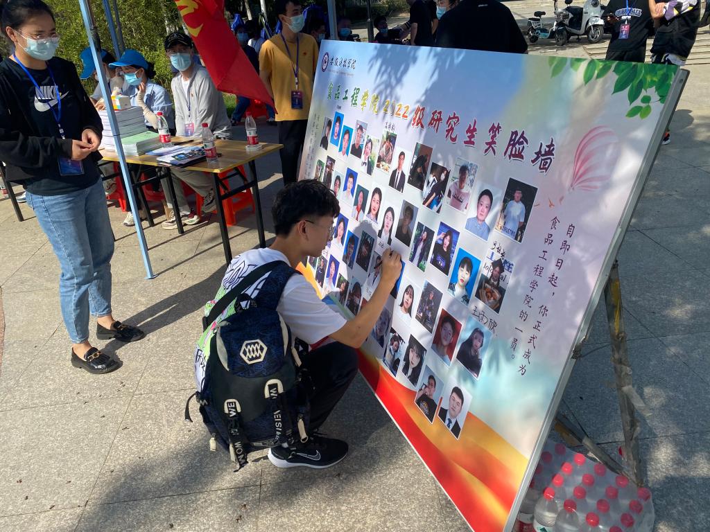 报到现场,食品工程学院竖立起的2022级研究生笑脸墙吸引了大量学生的注意,来校报到的学生纷纷到笑脸墙上找到自己的笑脸照片,签字留影。据了解,暑假期间食品工程学院联系了该院全体2022级研究生,用所有同学的微笑照片,共同完成了笑脸墙。动物科学学院为来校报到研究生悉心准备了迎新大礼包,学院院徽logo定制的米白色帆布袋,里面盛装着晨光文具与温氏酸奶,为新生送上入学后第一份温暖的礼物,也是对研究生未来科研学习生活的美好祝愿。
