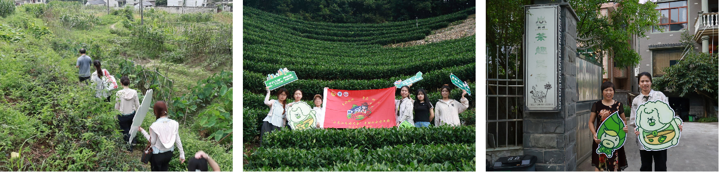 跟随民宿老板的脚步,团队成员们参观了茶园,听老板介绍每一丛茶树成长需要经历的过程,以及满园茶叶进行采摘的不易。服务团为民宿老板和他的茶园设计了特色IP“茶茶”(以茶壶与环溪村里的随处可见的温顺小狗为原型)、“叶叶”(以茶叶为原型),在助力农产品实现增值赋能的同时,让“茶趣”民宿拥有了属于自己的吉祥物。