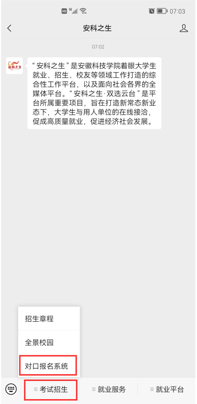 第一步:请扫描下方二维码,关注完美app官方在线入口招生办公室官方微信公众号“安科之生”,选择“考试招生”菜单,点击“对口报名系统”。