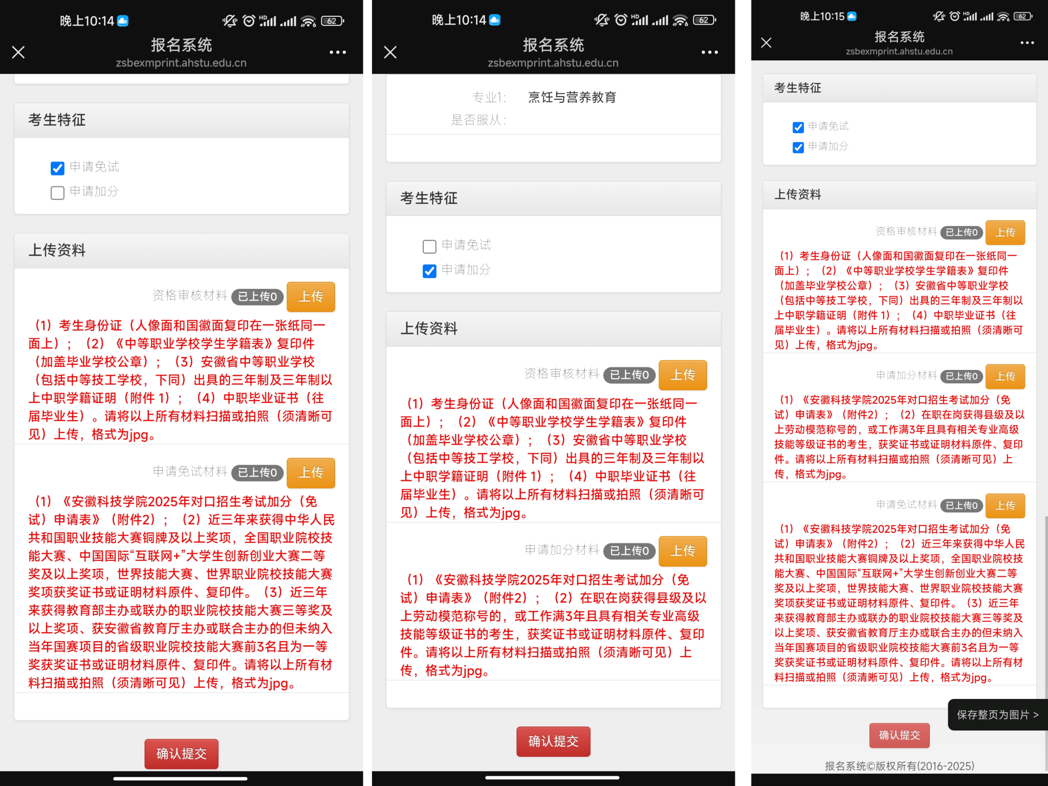 第六步:申请技能大赛免试、考试加分鼓励政策的考生,在“考生特征”板块,还需先勾选自己申报的鼓励政策选项,在上传“资格审核材料”基础上,按照要求上传“申请免试材料”或者“申请加分材料”。无误后,点击确认提交按钮,一旦提交,不可更改。